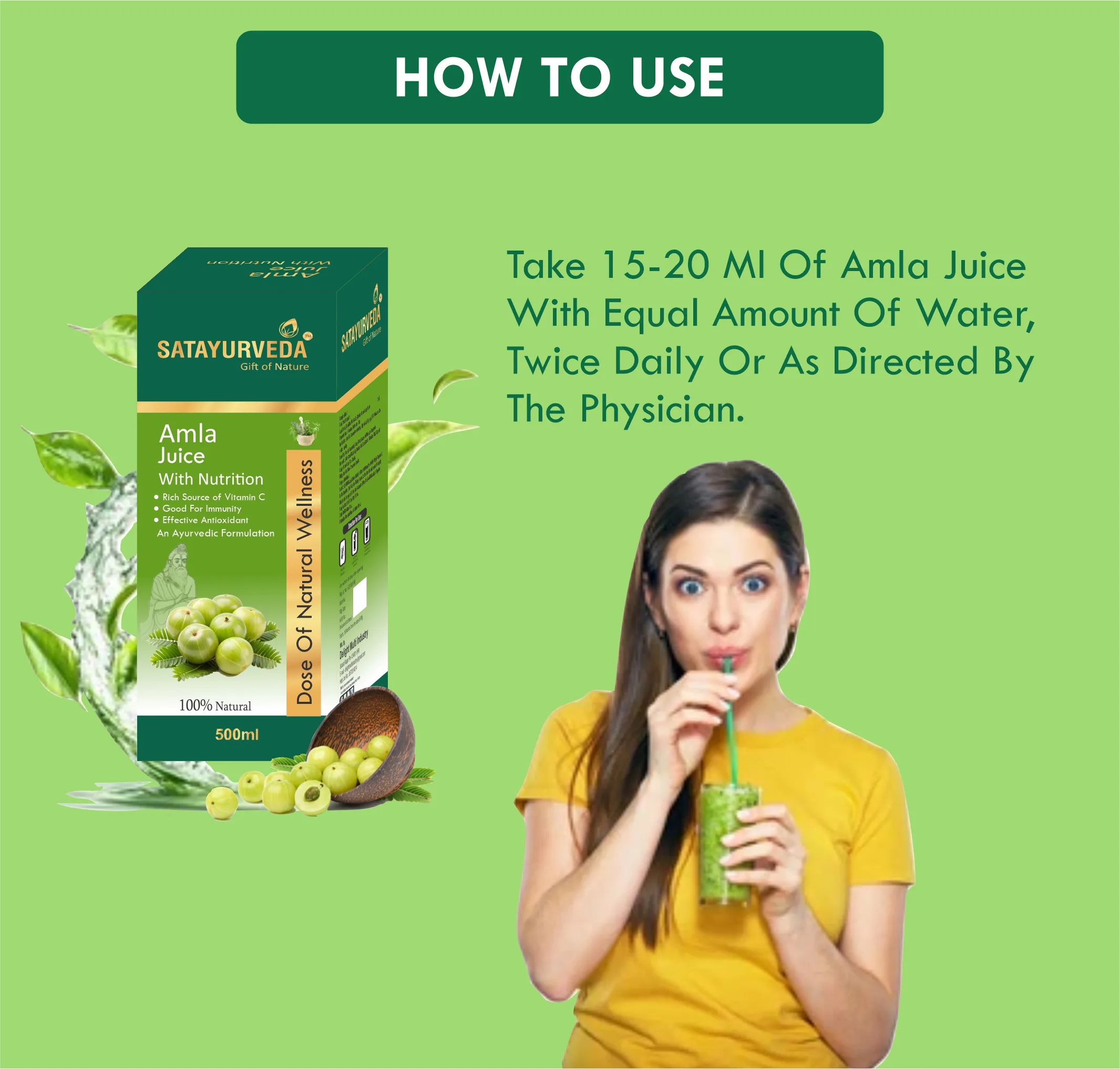 Take 30 ml (2 tablespoons) of Amla Juice twice daily before meals. Mix with a glass of water for best results.Amla Juice — Daily Dose of Natural Vitamin C for Immunity, Energy, and Healthy Living.