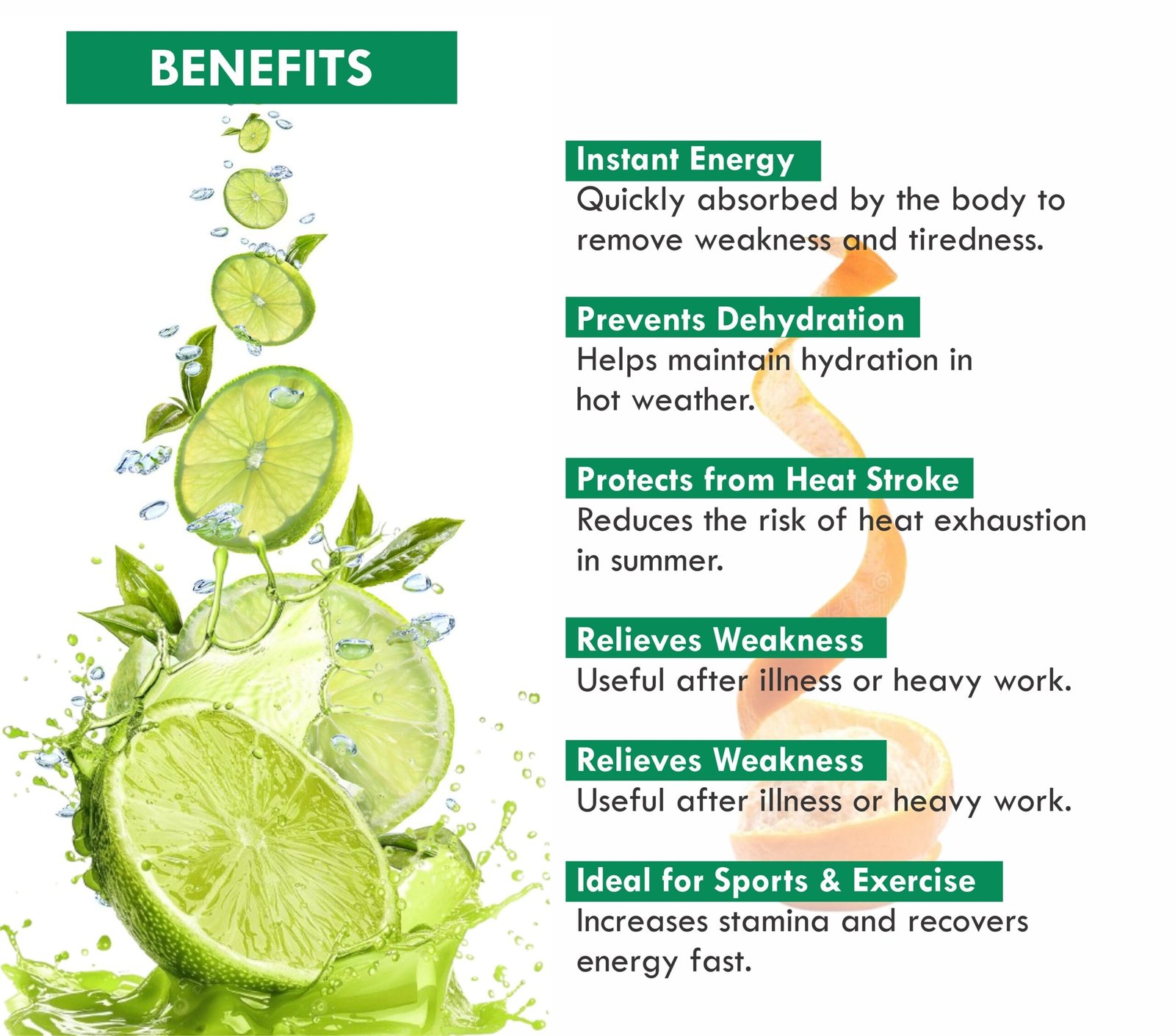 • Restores fluids and electrolytes lost due to heat or exertion.