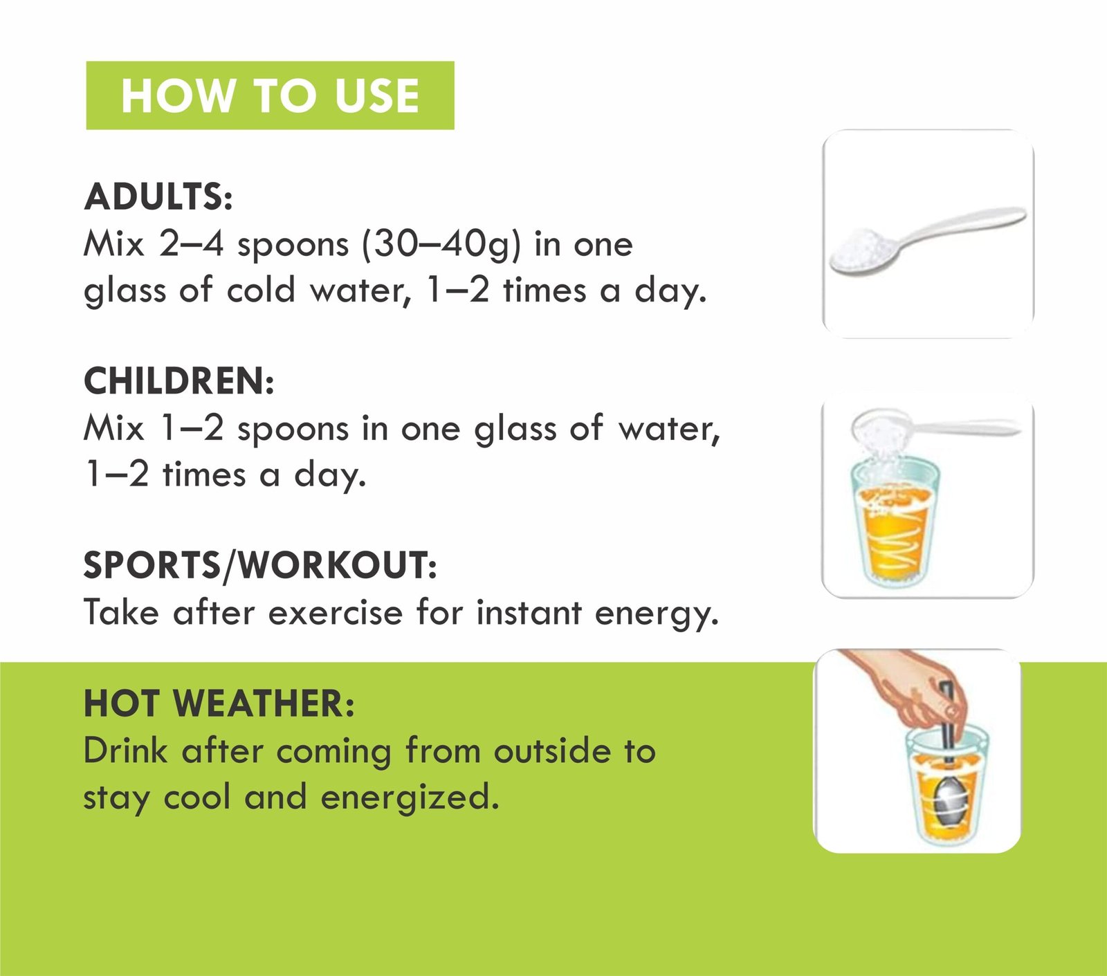 Mix 2 tablespoons (approx. 30 g) of Glucose-D Plain in a glass of cold water (200 ml). Stir well and consume instantly. Use whenever you feel tired, weak, or overheated.