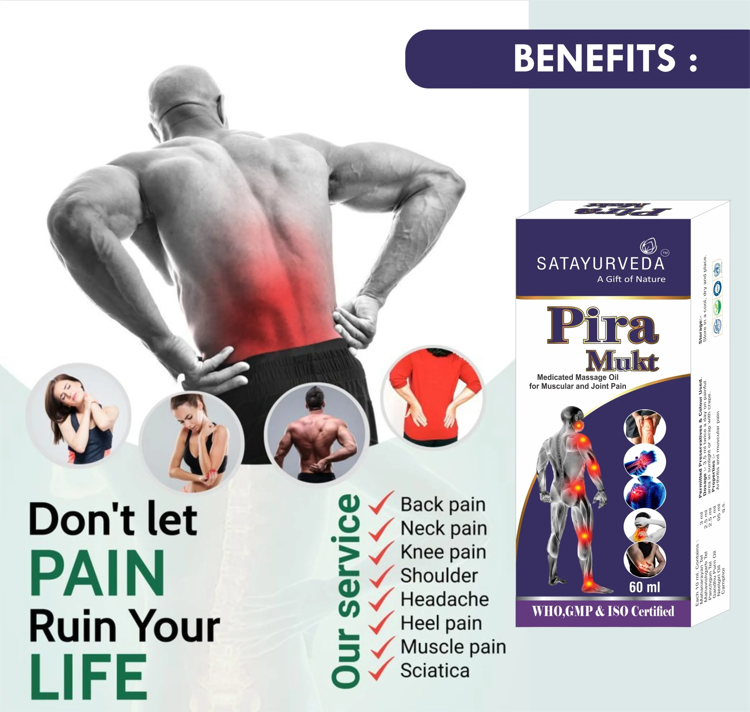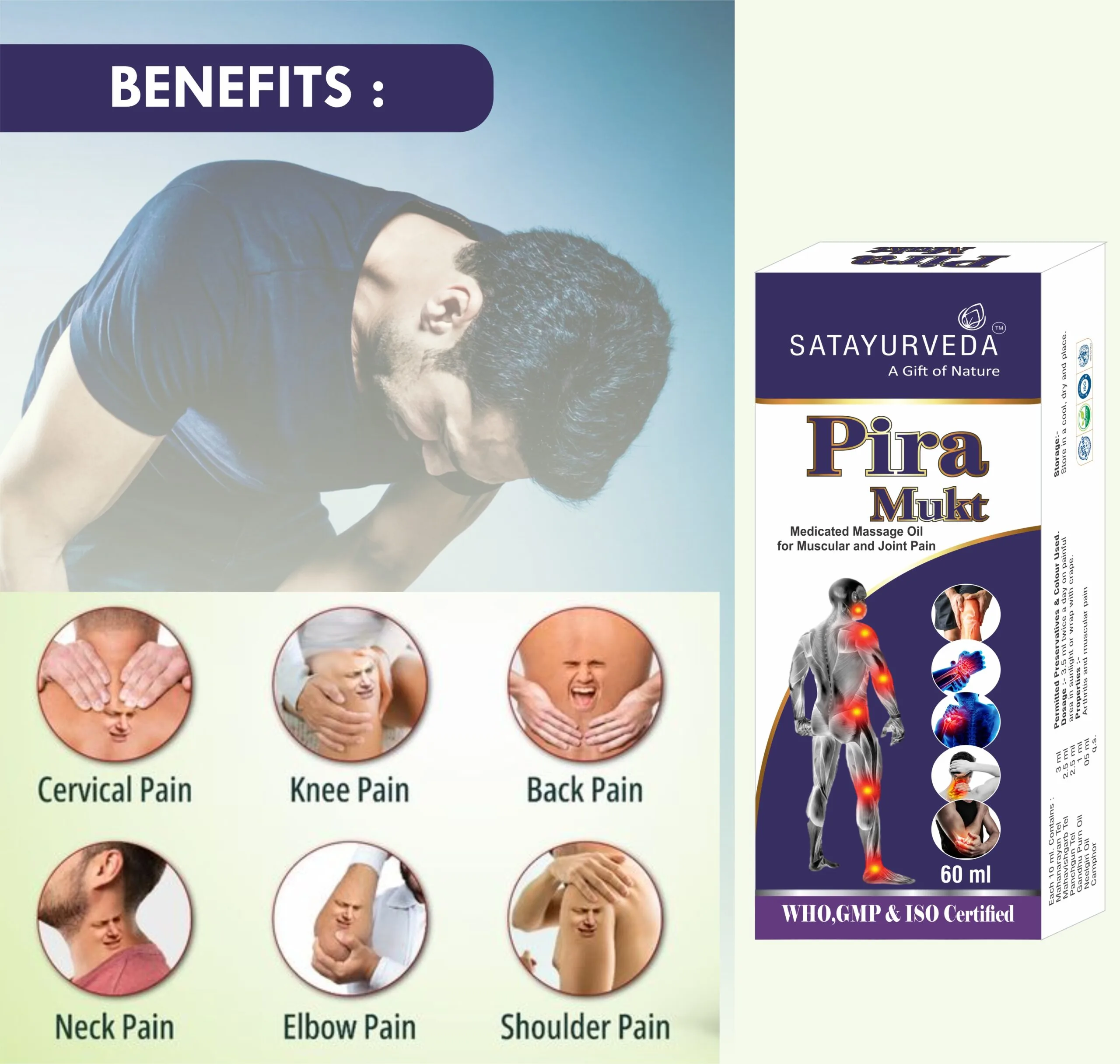 • Pain Oil with Goodness Of Nirgundi Oil, Gandhapura Leaf, Nilgiri Oil, Karpura Oil, Pudina Satva, Til Oil – best quality of natural ingredients used to provide superior pain relief.