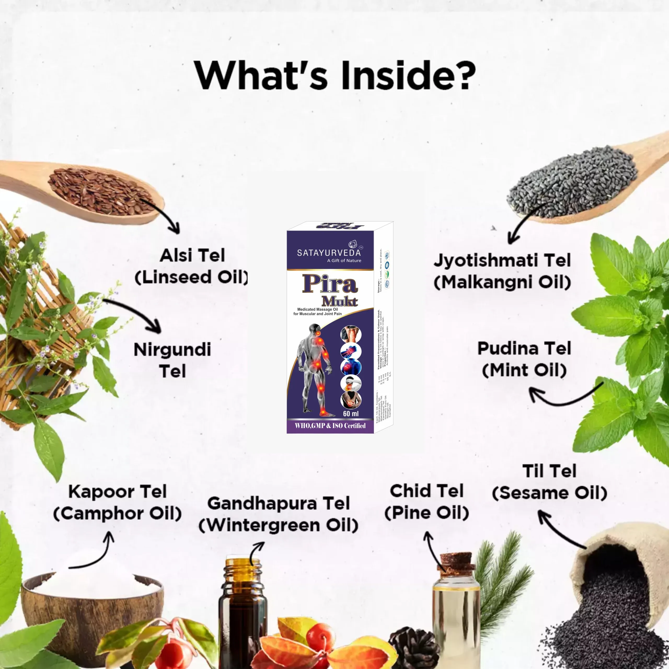• Massage Oil with Power of Effective Herb Blend for Superior Pain Relief: Discover the goodness of Nirgundi Oil, Gandhapura Leaf, Nilgiri Oil, Karpura Oil, Pudina Satva, and Til Oil. Body massage oil crafted with the finest natural ingredients for superior pain relief.