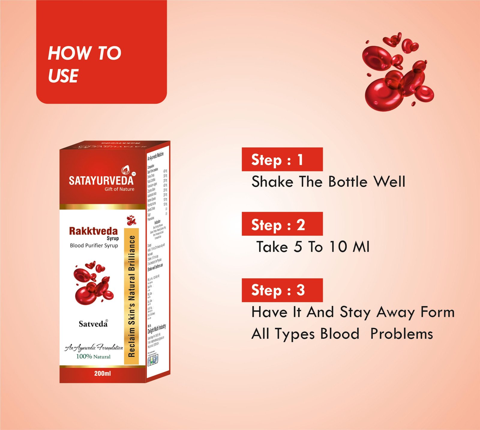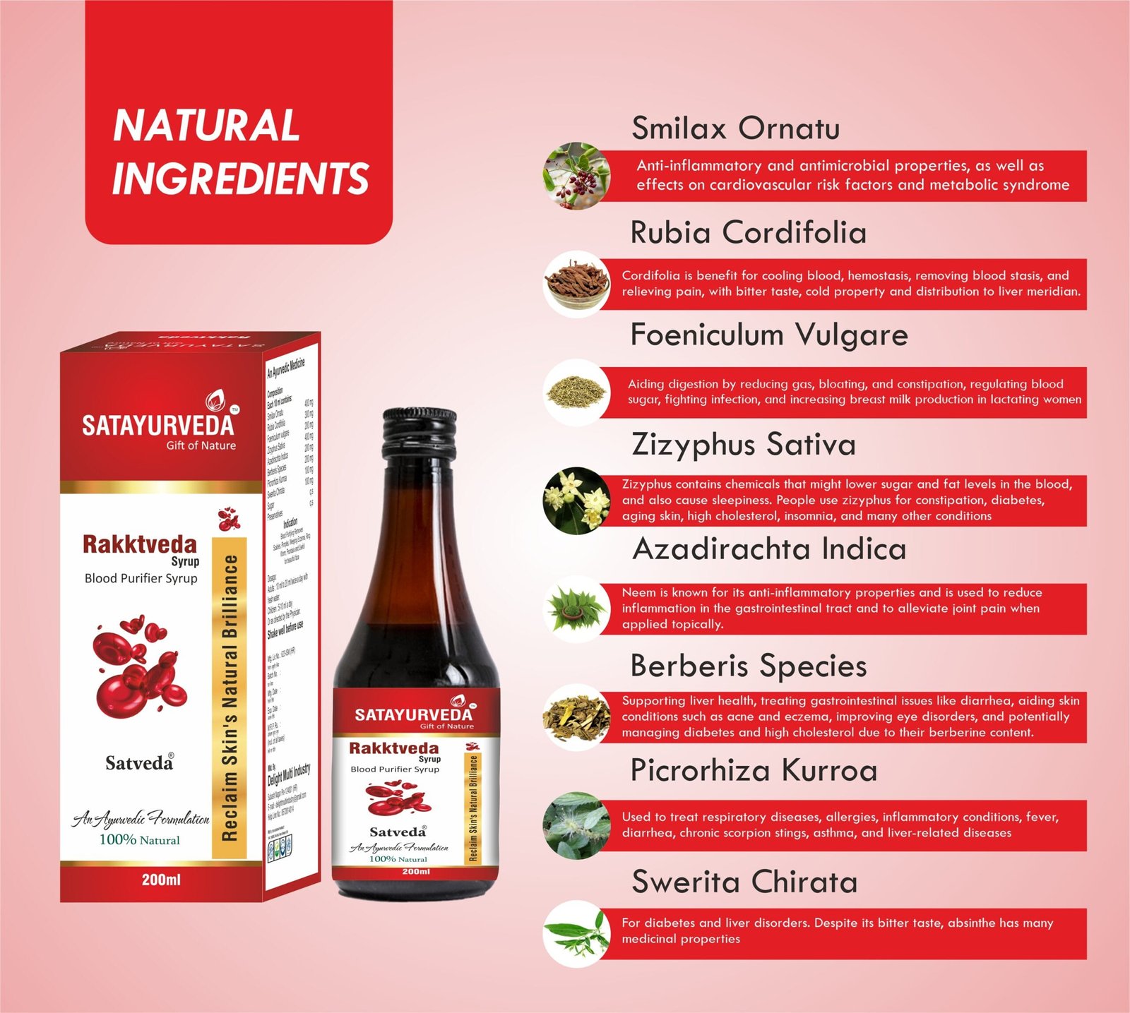 - CONTROLS ACNE & PIMPLES: Rakktveda Syrup for everyday use helps to prevent acne and pimples by controlling skin allergies. It is a useful blood purifier for acne & pimples and keeping bacterial infections at bay.
