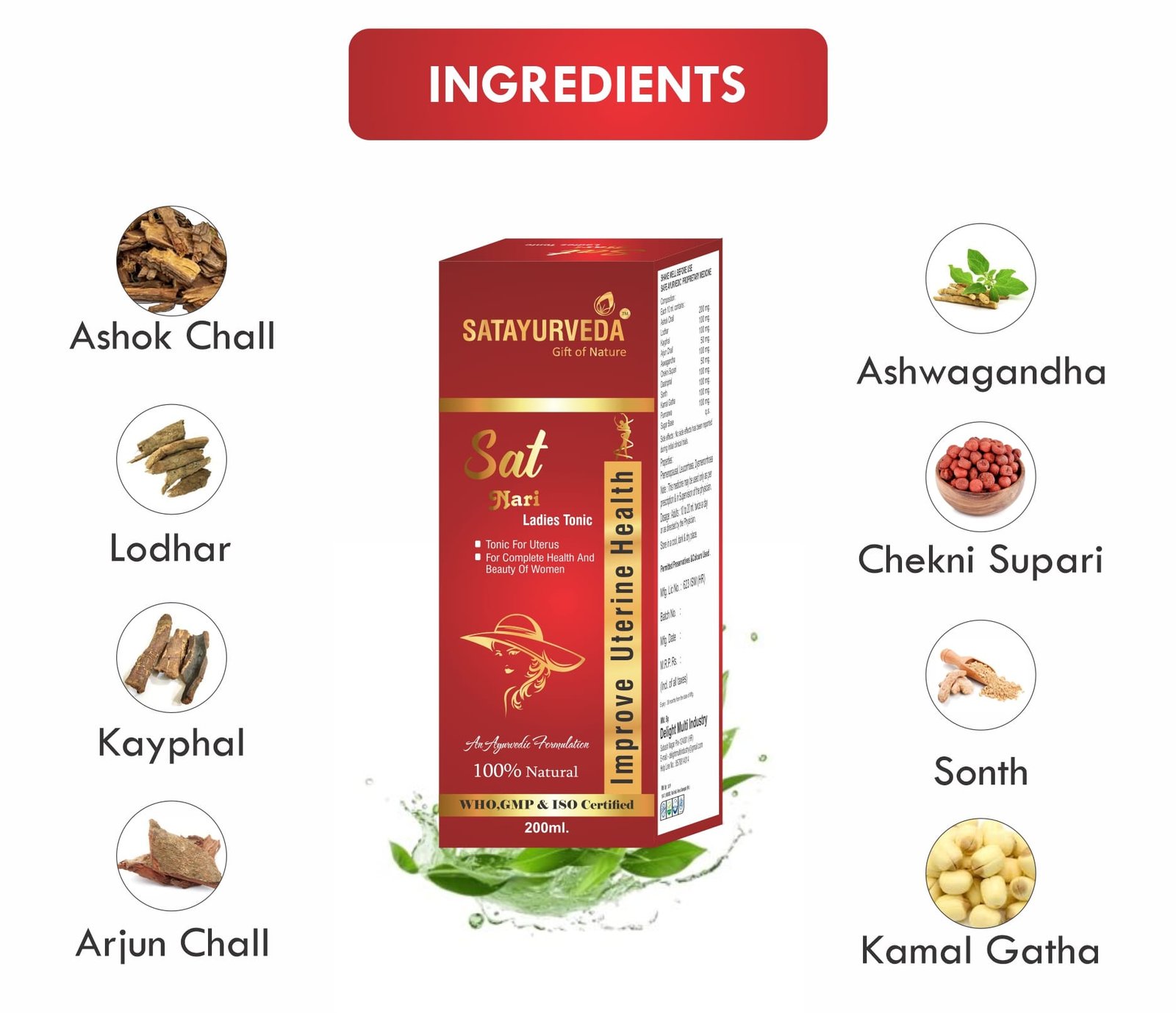 Sat Nari Utriene Syrup is a natural Ayurvedic uterine tonic formulated to support women’s reproductive and hormonal health. It helps regulate menstrual cycles, control excessive or scanty bleeding, and relieve menstrual pain, cramps, and weakness.Enriched with powerful herbs like Ashoka, Lodhra, Shatavari, Ashwagandha, Dashmool, and Manjistha, this syrup nourishes and strengthens the uterus, balances hormones, and promotes healthy menstrual function. It also helps reduce white discharge, improves fertility, and provides relief from PMS and menopausal symptoms.
