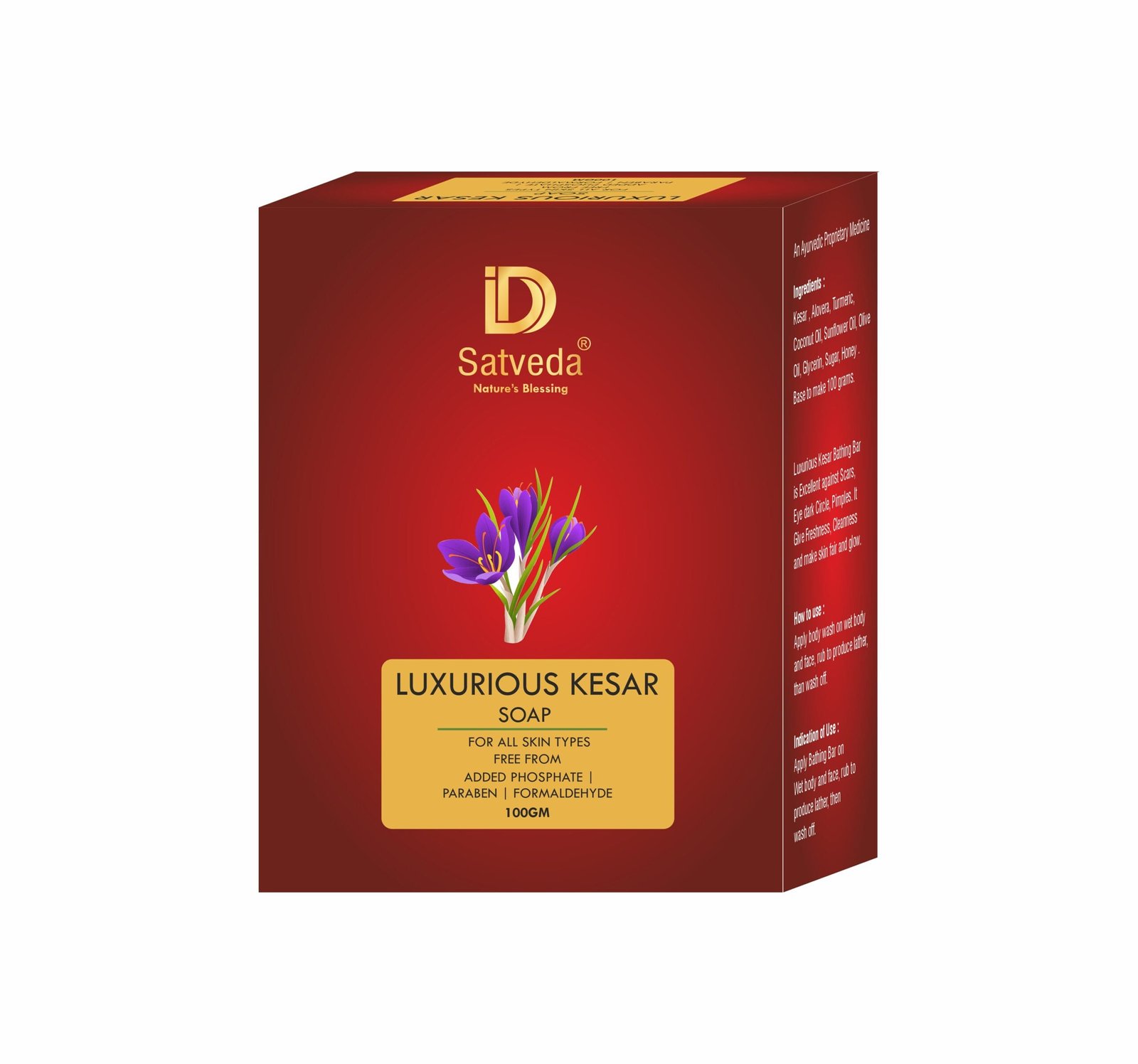 Satveda Luxurious Kesar Soap is a premium herbal bathing bar enriched with the goodness of pure Kesar (Saffron) and natural glycerine to give your skin a radiant, soft, and glowing appearance. Kesar, known for its skin-brightening and rejuvenating properties, helps reduce pigmentation, blemishes, and uneven skin tone while imparting a natural golden glow.The presence of glycerine ensures deep moisturization, keeping your skin smooth, supple, and hydrated throughout the day. Its gentle cleansing formula removes impurities without stripping away the skin’s natural moisture, making it ideal for all skin types, including dry and sensitive skin.