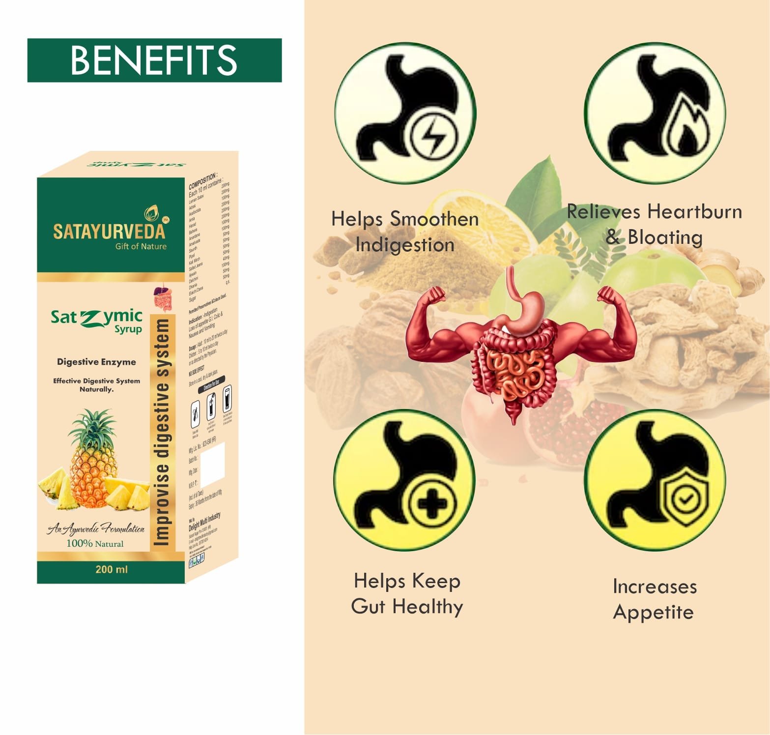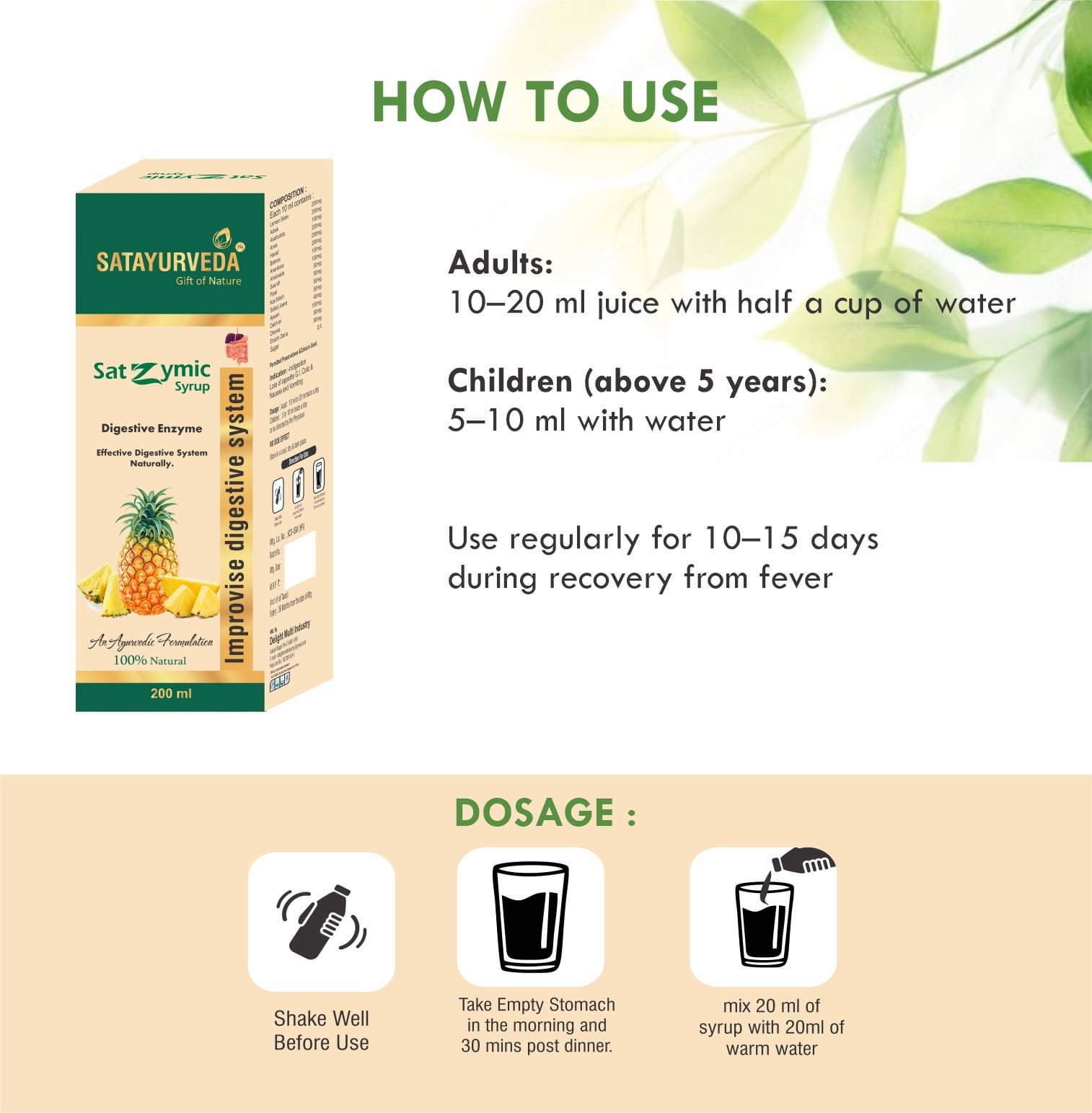 Enzyme Syrup is a natural digestive tonic formulated to support a healthy digestive system. It helps relieve problems such as acidity, gas, indigestion, sour burps, abdominal discomfort, fatigue, and loss of appetite.It enhances the function of digestive enzymes, promotes better nutrient absorption, and supports liver health. Acting as an antacid, alkalizer, and immune booster, Enzyme Syrup helps keep your stomach light and your body energized.